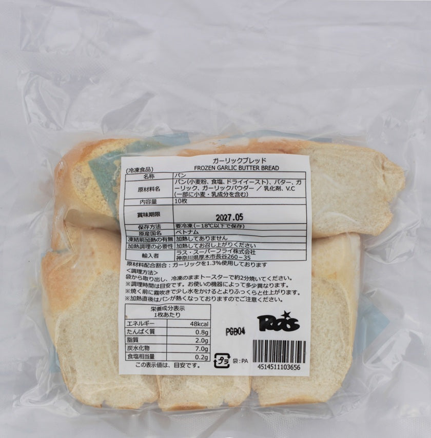 スライスしたフランスパンに、ガーリックバターが塗ったものを冷凍した商品です。